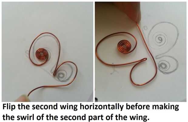Hacer el segundo bucle enrollando el alambre en la dirección opuesta a la anterior (primera ala) segundo bucle y el cable alrededor de ese bucle para crear un patrón swirly, el círculo