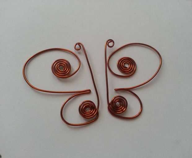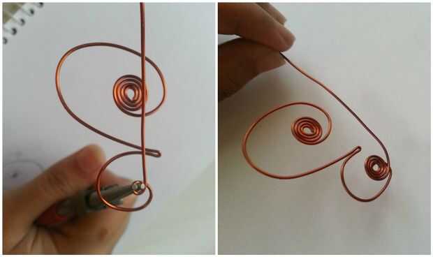Hacer un remolino, doble el alambre a lo largo de los bordes de la misma plantilla, pero cuando se llega a la segunda parte de la tapa del ala el cable horizontal,