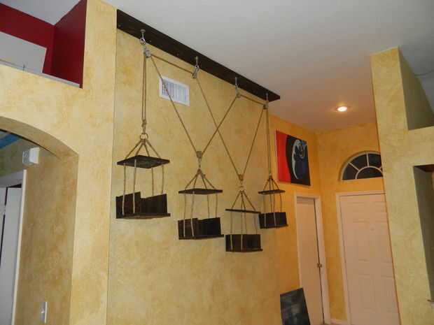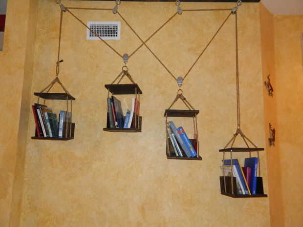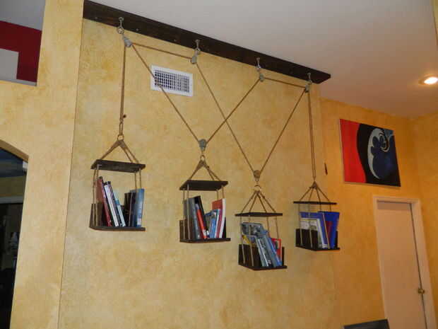 Básicamente, cuatro estantes (vainas) cuelgan de una línea principal. La línea principal alimenta a través de un sistema de poleas y es libre de moverse a través de ellos. Las poleas se cuelgan de armellas que están ancladas a un soporte sólido. La pieza de soporte está anclada al techo con tornillos largos.