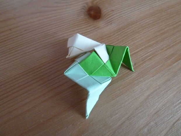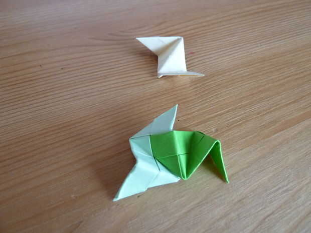 Comience con poner la esquina del módulo verde oscuro en el bolsillo del módulo verde luz. Tome el módulo blanco y poner su esquina en el bolsillo interno del módulo verde oscuro, el bolsillo interno había sido marcado en la segunda foto.