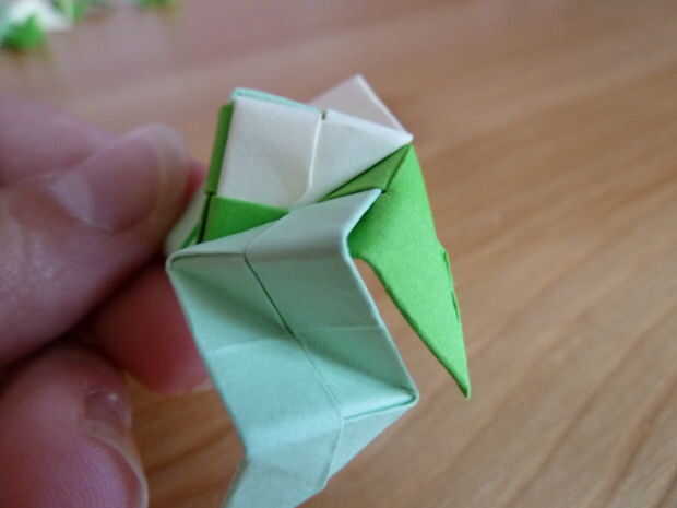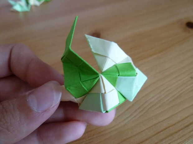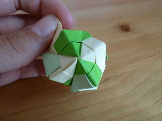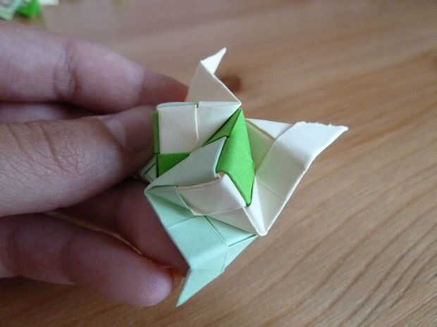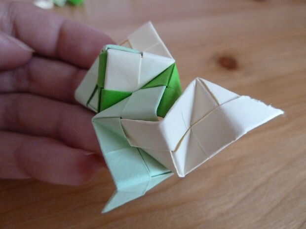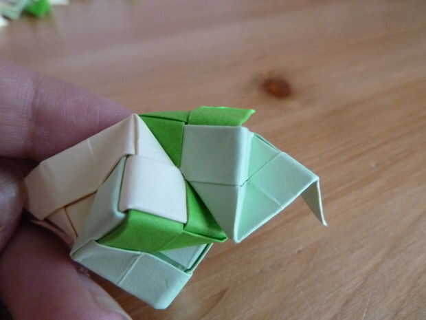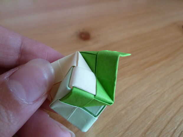 Cuando hay una esquina de un módulo en el bolsillo de un otro módulo, hay todavía un bolsillo vacío. Han utilizado dos colores, por lo que en el bolsillo va a ir la esquina de un módulo con el tercer color.