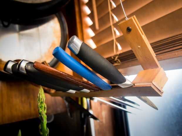 El primer diseño que hice tenía los cuchillos apuntando recto hacia abajo, pero he encontrado alcanzar para algo bajo la fila de cuchillos muy desconcertante.
