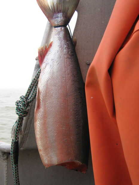 Corte la cabeza y extraer los órganos. ATA una cuerda alrededor de la cola y colgar fuera del sol. Sangre en la carne generalmente sabe mal. Un lomo de salmón no puede tomar la fuerza de retenidos por la cola sin que se rompan, así que extra seguro que sangran los peces si va a colgar. Se trata de un salmón rojo después de un día de suspensión. Algunas personas sólo enviarán el pescado encima de la cabina en la sombra, pero ayuda a salir más sangre que cuelga.