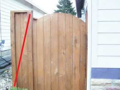 Las tapas de los postes de dos 4 x 4 necesitan ser tirado lejos de la casa un poco. La manera simple de hacerlo es agregar un puntal que se tire para acortar la línea roja que he puesto sobre la foto.