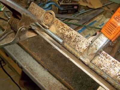 Soldado algunos varilla de 5/16 de pulgada de rosca hasta el final de una pieza de barra de refuerzo de concreto de 3/8 de pulgada. Hice una cuña del punto en el extremo de la barra de refuerzo para una soldadura más completa. Después de la soldadura, me corte la extensión de la varilla roscada a la barra de refuerzo a aproximadamente 2 pulgadas de largo y presentó al final tan una tuerca se puede colocar en la rosca fácilmente.