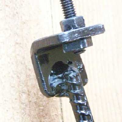 Utilicé una pieza en forma de "L" de hierro de ángulo para la parte del ajuste. La varilla roscada pase a través de un agujero en el ángulo y el ajuste se fija con dos tuercas. El ángulo está soldado a la pieza de barra de refuerzo. Probablemente de utilizar acero más pesado, más grueso de lo necesario, pero estaba no cierta cuánta tensión se necesitaría para sacar los postes de 4 x 4 en la alineación.