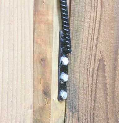 La parte inferior placa de montaje es una pieza de hierro de la correa de 1/8 de pulgada 3/4 pulgada de ancho y cerca de 4 pulgadas de largo. La sección soldada con autógena tiene una pulgada o tan de solapamiento para una buena tira fuerte. Usé tres agujeros con tres 1/4 de pulgada pernos cada 1 1/2 pulgadas de largo. Debido a la forma en que la cerca es construida, muy poco de 4 x 4 post está disponible para la placa de montaje. Por esta razón utilicé varios pernos.