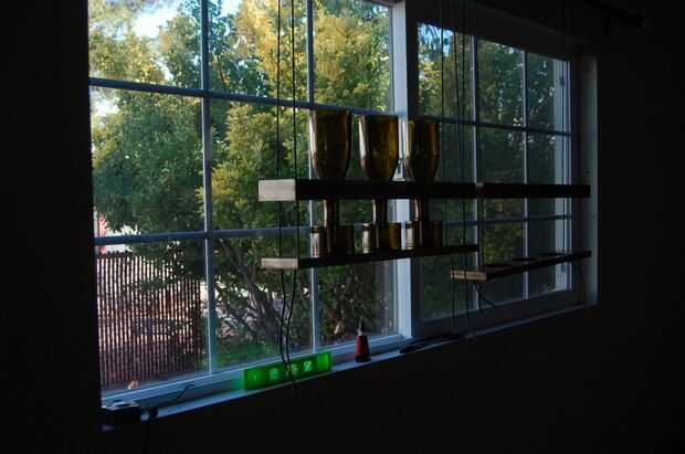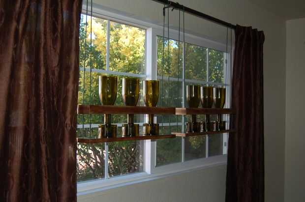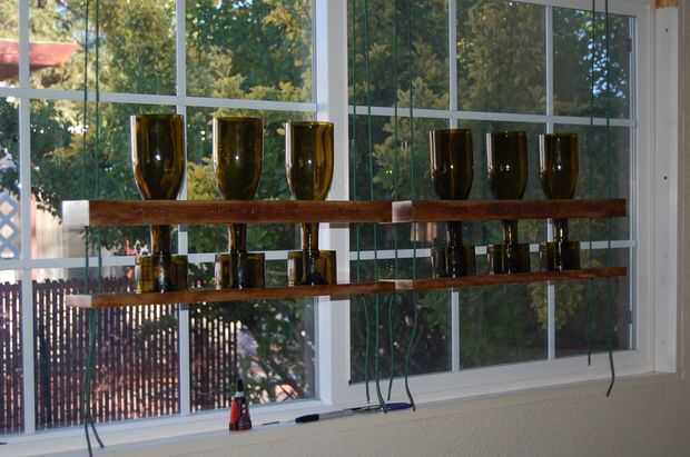 7. tensión de los cables durante la noche. Corte botellas los extremos de la botella se colocan en los estantes y dejados durante la noche para tensar las cuerdas.