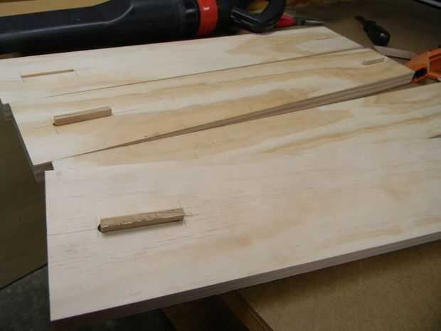 6. pegue los componentes del canal de estante superior. Seleccione un par de tableros del estante superior. Propagación de madera pegamento sobre una superficie de cada placa y los surcos de la ranura con un pincel barato---el cepillo pueden limpiar con agua y volver a utilizarse. Inserte las ranuras en las ranuras y pegamento en las partes expuestas de las ranuras. Junte las dos superficies de la cola mientras se asegura que las ranuras encajan en las ranuras. Coloque varias abrazaderas en el montaje y apriete agresivamente. También, cuidadosamente raspe globos lejos de pegamento squeeze-out pero no limpie o los frotis porque el pegamento seco será difícil de quitar y evitará que la absorción de manchas. Apartar la Asamblea y no permita que se seque durante la noche. Repita el procedimiento con el segundo conjunto de componentes de la plataforma superior.