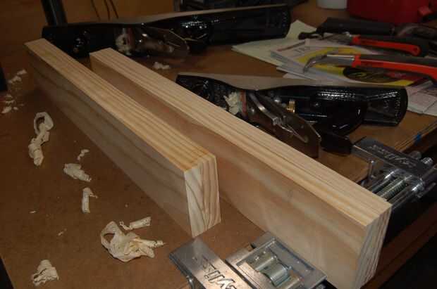 8. plano de los bordes laterales de las Asambleas del estante superior. Montaje de un conjunto de estante superior en un tornillo de banco de trabajo. Utilice un plano n º 5 (Jack) para recortar los bordes laterales de las piezas hasta que queden al ras. El plano no. 5 es seguido por un Nº 7 (ensambladora) para asegurar que el borde largo es de 90 grados a las caras y paralelo a la mesa de trabajo. Este paso se repite con los otros bordes para eliminar cualquier superposición. Por último, las dos partes de la repisa superior se colocan sobre una superficie plana y celebró junto a indicar diferencias en la altura. Estas diferencias se eliminan por el trabajo adicional del avión. Las partes deben cepillar hasta que son exactamente lo mismo. Además, se planean los bordes de grano de extremo plano con un plano de bloque. De la nota, el plano no. 5 también puede utilizarse en los bordes.
