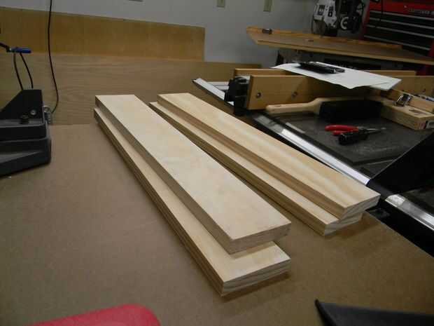 5. cortar tiras. Una mesa de la sierra se utiliza para cortar cuatro tiras 1/2" de ancho y 1 7/8" largo de la acción de madera contrachapada de 1/4".