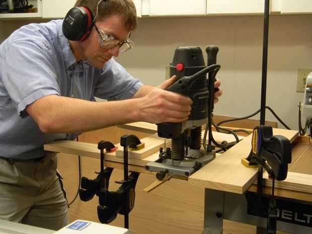 4. cortar ranuras de spline. Un router de inmersión con una espiral de corte hasta 1/4" bits se utiliza para cortar las ranuras de la spline. Antes de cortar, la obra está sujeta a una superficie y la profundidad de corte se establece en 1/4". Además, la madera sobrante se sujeta a la superficie de trabajo para proporcionar topes positivos para el recorrido del router.