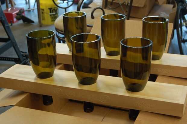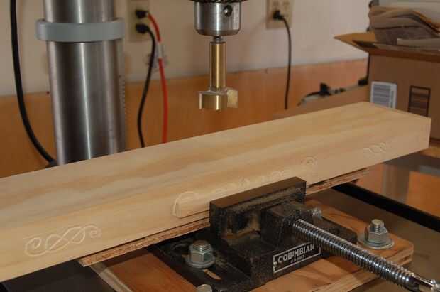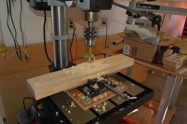 2. perforar agujeros en aburrido en los estantes superiores para las botellas cortadas. En primer lugar, encontrar una o dos piezas delgadas de madera de desecho más estrecha de la plataforma. Coloque la madera en los caminos de la mordaza del taladro. A continuación, encontrar dos piezas delgadas de madera de desecho que se puede colocar entre las mordazas de la prensa y los bordes de la plataforma. Coloque el estante en la mordaza y apriete asegurándose de que la parte inferior de la plataforma está en contacto con la madera de desecho. Siguiente, Monte un forstner 1 1/2" broca en el taladro y alinee el centro del agujero de una botella con la broca. Perfore a través de la plataforma. Se debe tener en cuenta que la madera se utiliza para minimizar las rasgaduras en la superficie inferior. A continuación, reemplazar el 1 1/2" broca con un 2" forstner bit. En el agujero a una profundidad de 7/8". Seleccione otra ubicación de agujero de la botella y repetir el procedimiento hasta que todos los seis agujeros se cortan. Cabe destacar que estos diámetros de taladro y la profundidad de agujero contrataladrado son óptimas para la variedad de botellas seleccionada. Estas dimensiones se encuentran mejor experimentando con restos de madera y un juego de brocas forstner.