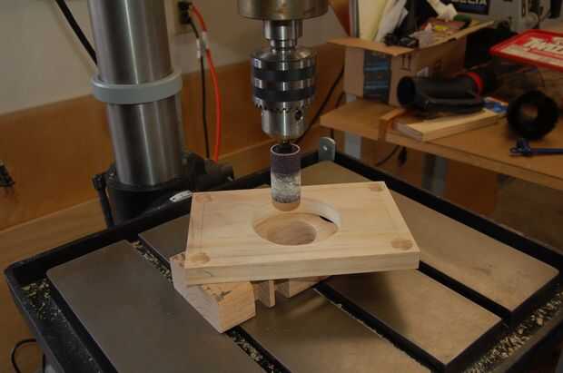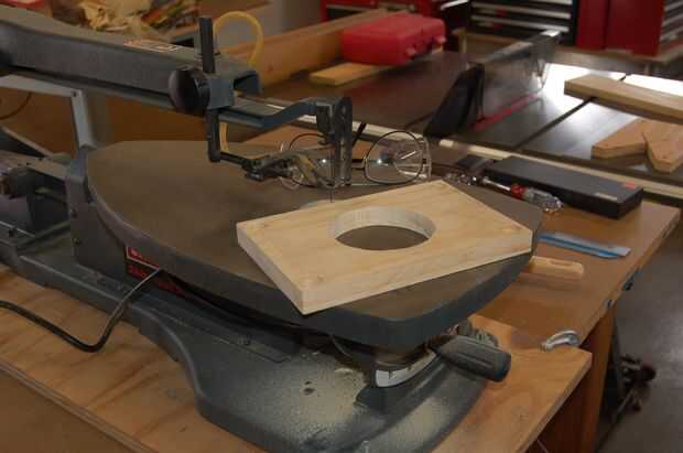 5. Corte el orificio de la plantilla de router. Comienzan por perforar un agujero en el centro de la acción de la plantilla. A continuación, coloque el caldo en una mesa de Sierra de calar y la hoja por el agujero del hilo de rosca. Proceder a cortar el agujero de la plantilla con la Sierra de calar y corte dentro de la línea. A continuación, la arena el agujero al final radio con un tambor de lijar montado en una prensa del taladro.