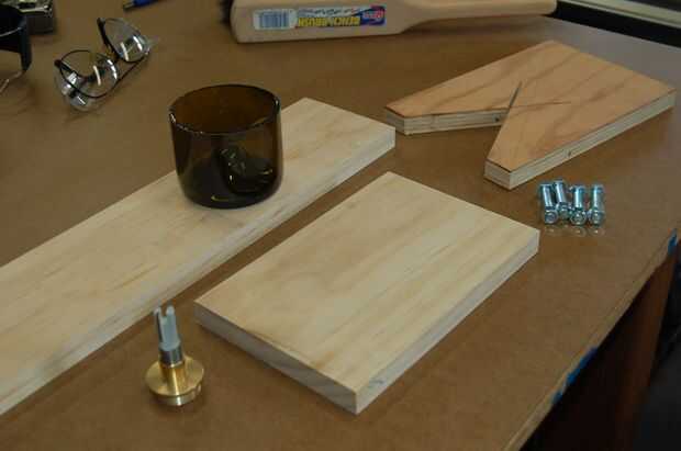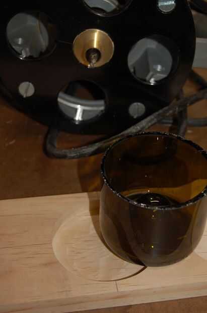 1. determine el diámetro de los huecos. En primer lugar, medir cada extremo de la botella en dos lugares con una pinzas de disco. Este ejercicio revela que las botellas no son redondas. Nuestra botella típicamente difieran de 0.030 a 0.040." A continuación los datos de medición de la botella se utilizan para elegir un diámetro de recreo que se ajuste a todos los extremos de la botella. En nuestro caso, esta dimensión es 3 1/4" y se verifica trazando un círculo un pedazo de papel con un compás y colocar la botella termina sobre el círculo.