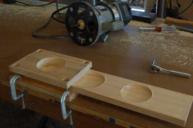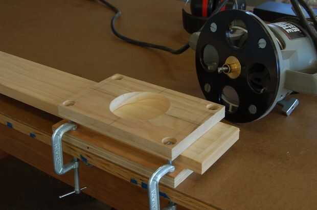 7. prepare el router y realizar una cavidad de prueba. En primer lugar, instale la manga de punta y plantilla de router seleccionado. A continuación, establecer la profundidad de corte agregando el ancho de la plantilla a la profundidad de la hendidura. En nuestro caso la profundidad es 1/2", y el grueso de la plantilla es 3/4. A continuación, corte un pedazo de acción las dimensiones áspero de la un estante inferior para crear una pieza de prueba. La probeta es posteriormente en la plantilla y sujeta por los tornillos de sujeción. La plantilla se fija posteriormente al Banco de trabajo. A continuación, una hendidura se corta con el router. Finalmente, la probeta se quita de la plantilla y un extremo de la botella se utiliza para confirmar un ajuste satisfactorio.