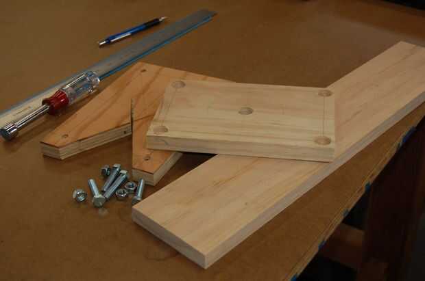 4. Marque la ubicación simétrica de cuatro pernos de sujeción de 1/4". La plantilla de corte está diseñada para emparedado el estante inferior entre la plantilla y una placa de respaldo, que a su vez, está sujeta a una mesa de trabajo. Por lo tanto, los pernos de sujeción deben ubicarse de tal manera que la bandeja inferior puede caber entre ellos. Además, un método de referencia de centro debe utilizarse para tener en cuenta las diferencias en las dimensiones de la acción de la plantilla y placa de refuerzo. Una vez que los agujeros de los tornillos de sujeción están marcados en los valores de la plantilla, el procedimiento se repite para la placa de soporte.