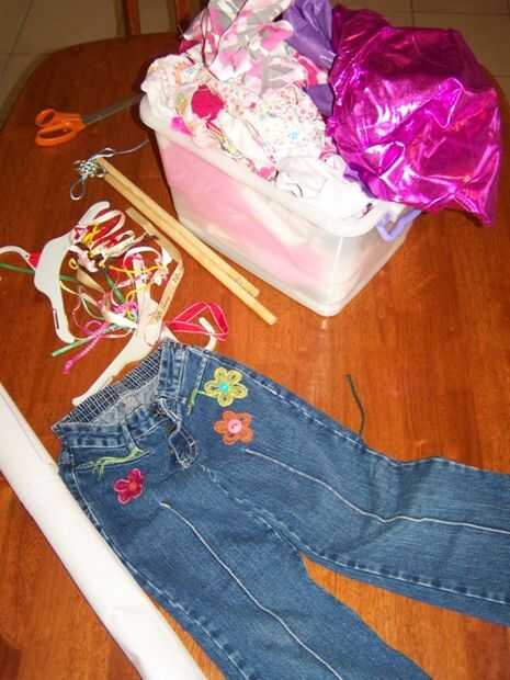 Un par de pantalones vaqueros - u otros pantalones Retazos de tela para los bolsillos y en la colmena Refuerzo para mantener la forma de la percha Varillas y cinta para colgar