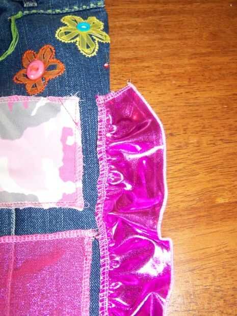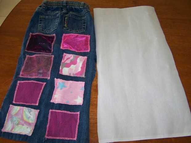 Cortar un trozo de tela de refuerzo el mismo tamaño que la base de los pantalones vaqueros, luego pin las 3 piezas juntas - refuerzo en la parte inferior, a continuación jeans en la parte superior y volante en la parte superior.