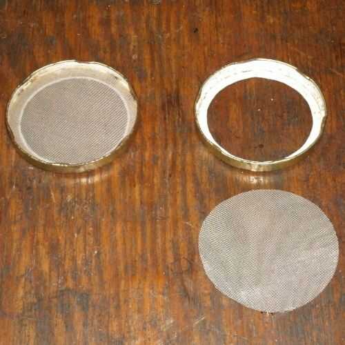 Sin pantalla de acero inoxidable, yo probablemente substituiría paño de queso o mosquiteras para él. Una capa de paño de queso puede realizarse por el anillo de la tapa. Si no es así, el paño de queso podría celebrarse con bandas de goma o cadena, en vez del anillo de la tapa.