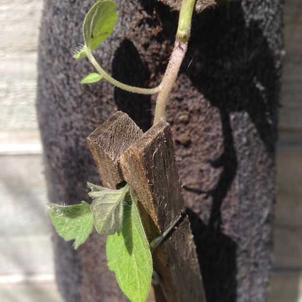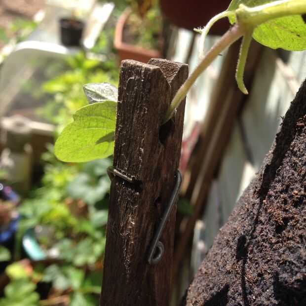 La planta de tomate se cuelgue finalmente por sí mismo pero hará un tallo más fuerte si se guiará por medio de una simple clavija de ropa. No pellizque la plántula. Sólo asegúrese de que la parte blanda de la planta está justo en el agujero de la clavija así su no dañado. Simplemente usted ponderación lo hacia abajo para que comience a crecer hacia abajo. Pronto caerá debido a la gravedad pero sin riesgo de rotura :)