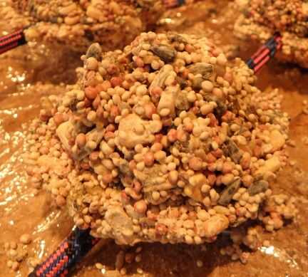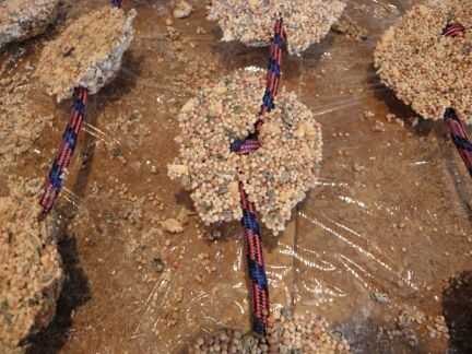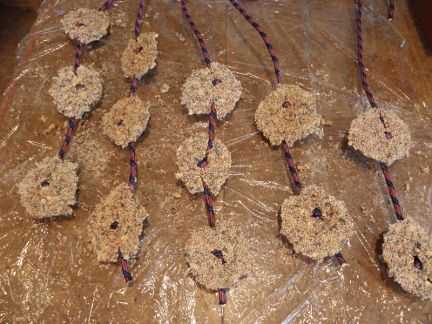 Mezclar más semillas harina, pegajosas y poner blops en el otro lado de la cuerda, hasta que estén más o menos esféricas.