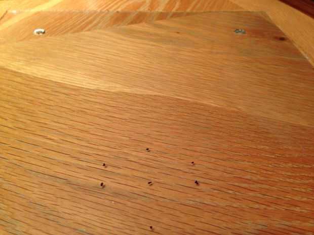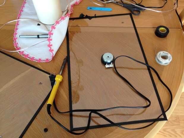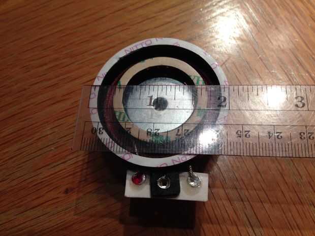 Ahora que tienes las marcas hechas, voltee los cristales y retire el papel de cera de los dos anillos en los transductores. Cuidadosamente y firme les Coloque en el centro. Asegúrese de que ambos transductores de rotación de la misma forma, idealmente en una dirección que los cables se cuelgan abajo de los agujeros que usted acaba de hacer.