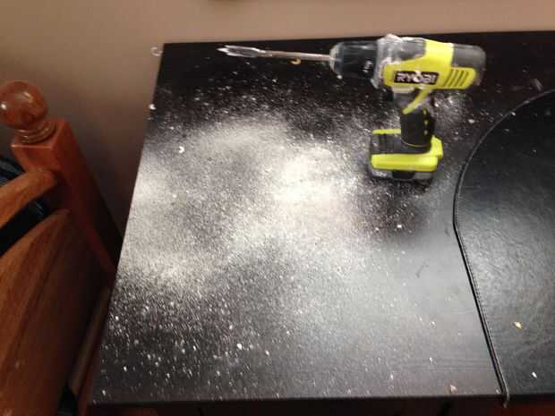 Tomar la perforación de 3/8 bit y empezar a taladrar los agujeros. Este es un muy polvoriento proceso así que asegúrate de nuevo que su escritorio está claro para fácil limpieza.