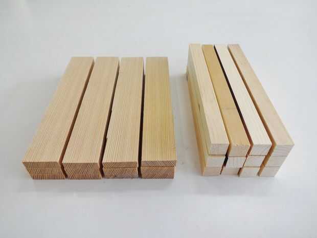 Las piezas planas son 3/8" de espesor por 1 1/2" de ancho y fueron cortadas de 2 por 4. Las otras piezas son 3/4" cuadrado, corte de tablas de pino de chatarra.