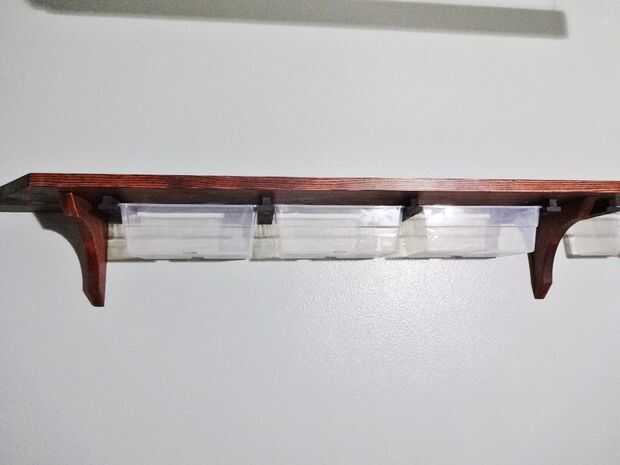 Las calas se atornillan a los estantes con tornillos de 2". Estaba atento colocar las abrazaderas como sea necesario para que los contenedores fueron apoyados completamente como sea posible, pero no pinchado en todos.
