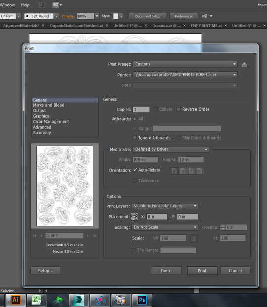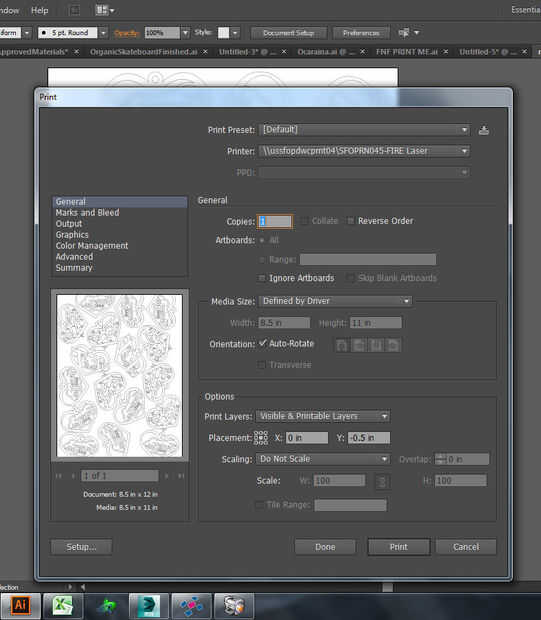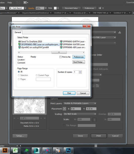 Control P, o archivo > Imprimir, produce el cuadro de diálogo mostrado en la primera imagen. Varios de los ajustes eran incorrectas - subió con el tamaño de página predeterminado de 8.5 x 11, que estaba cerca pero no lo suficientemente bueno como los colgantes se fueron a 12 pulgadas. Sin embargo, la forma de realizar estos cambios es unos cuadros de diálogo más adelante. Primero hacer clic en configuración en la parte inferior izquierda, para obtener el cuadro de diálogo en la segunda imagen. En eso, asegúrese de la impresora correcta está seleccionada y haga clic en preferencias.