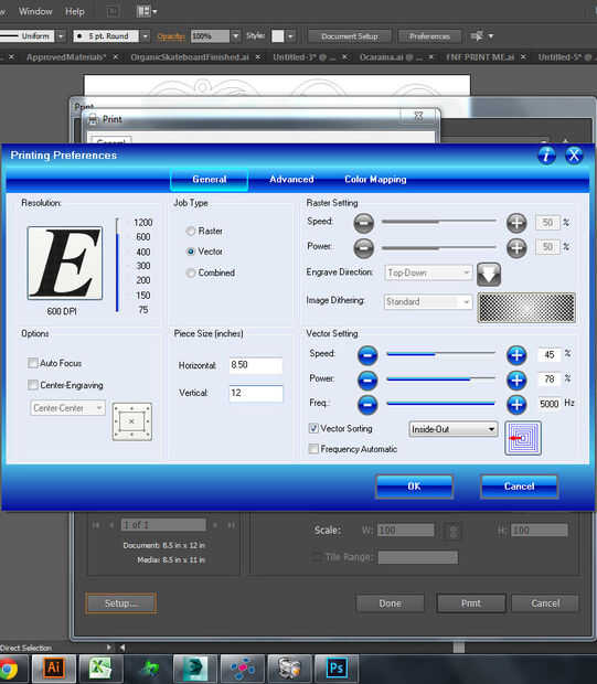 Finalmente han conseguido el cuadro de diálogo de configuración de Epilog. Aquí es donde introduzca el tamaño de la configuración material, la velocidad, potencia y frecuencia y una opción de cómo el software decidirá sobre su orden de corte. Ver notas en la imagen para más detalles. Estuve cortando acrílico de 1/8", para lo cual Epilog recomienda velocidad 50%, 70% de potencia y frecuencia de 5000 Hz para su láser de 120 vatios. (Configuración de trama tiene diferentes recomendaciones pero no estaba haciendo ningún grabado para que no lo hizo entre los). Este conjunto de valores trabajado para nuestro acrílico azul, pero los otros colores por alguna razón no atravesaría bastante con esos valores. Encontró 45% de la velocidad, potencia de 78% y 5000 Hz (máximo) trabajado bien para nuestro blanco, negro, turquesa, naranja y mate acrílico claro. Siempre es una buena idea ejecutar algunas pruebas sobre el material que esté cortando, como todo es un poco diferente - incluso los ajustes del laser, día a día.