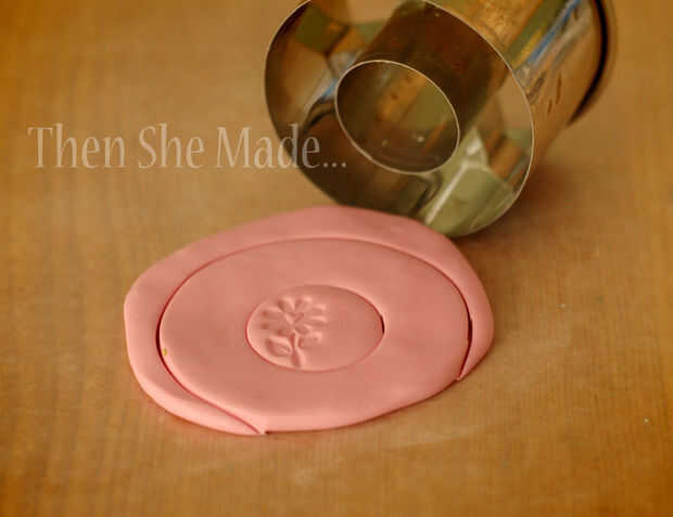 - Utilizar una herramienta de corte y cortar la arcilla en la forma que desee y luego retire cuidadosamente la arcilla sobrante. Consejo: yo siempre sello de mi diseño antes de cortar. De esta forma que yo puedo línea cortador mejor con mi diseño. Además, si usted estampar después de que la forma se corta, corre el riesgo de aplanar el borde y su colgante parciales.