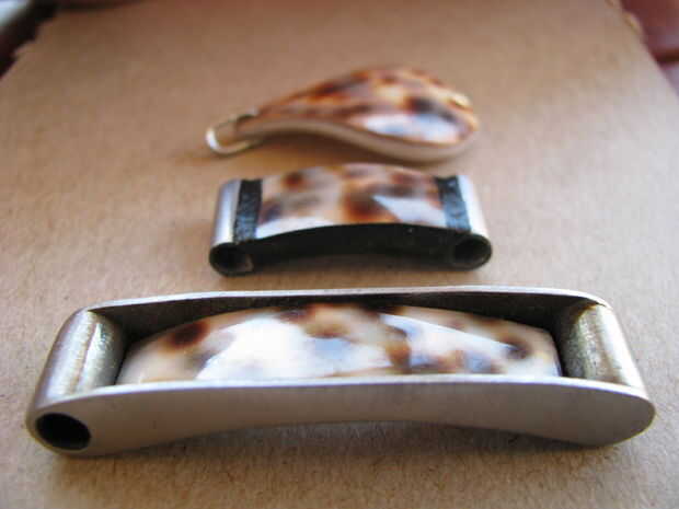 abuelo de mi esposa pasó años recogiendo conchas de mar y la costa de México. Un día que le dio a mis hijos una caja de esas conchas. Esta cáscara del cowrie particular cayó a poco de las manos y se rompió por la mitad. Tan naturalmente, hice colgantes =).