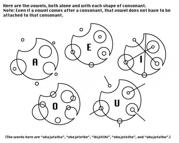 Las letras se agregan del mismo modo, va en sentido contrario en su círculo. Al comenzar una palabra nueva, también iniciar un nuevo círculo. Círculos pueden mirar más a la forma de vacío creado por las letras T, SH, R, S, V y w el.