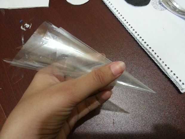 Tome un pedazo de papel de polietileno grueso y cortar en forma cuadrada. Comenzar a rodar el papel de una esquina a una forma de cono y utilizar un pequeño pedazo de cinta scotch para cinta de los lados. Asegúrese de que el agujero en el cono no es demasiado grande, de lo contrario no podrás hacer diseños detallados. Llene la mitad del cono con pegamento blanco.