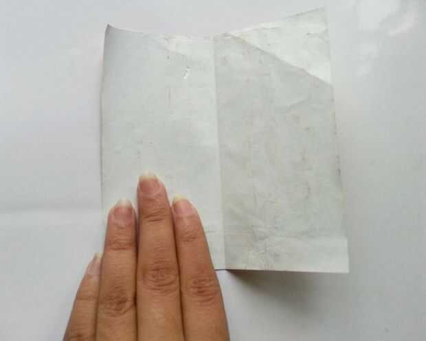 Doble la envoltura en la mitad para marcar la línea central y luego desdóblela. Pero antes de doblar más lejos te vas a tener que aplicar papel / refuerzo de tela en toda la superficie interior del contenedor.