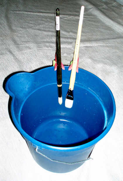 Mis pinceles grandes mantienen perdiendo su equilibrio y caer en los contenedores se remojo en.  Así que para cualquier persona hacia fuera allí que es tan lento para coger lo que a mí, esto es una manera fácil y verdaderamente estable para mantener los cepillos más grandes colgantes en recipientes profundos.