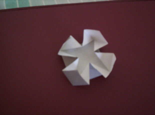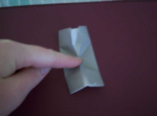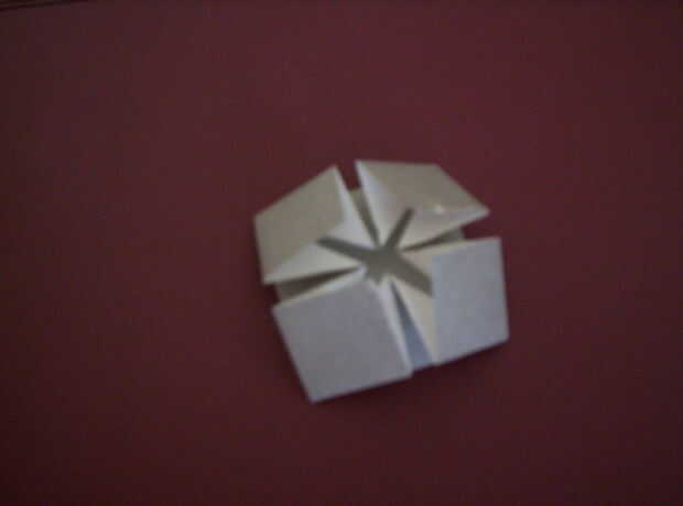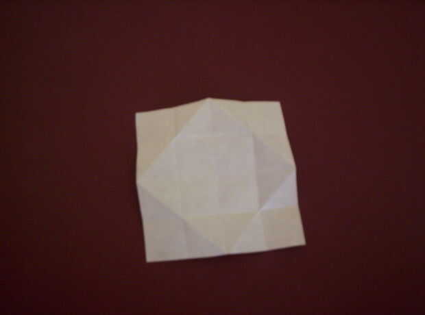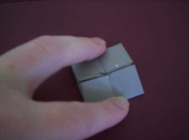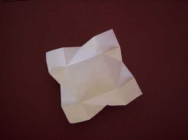 Se dobla cada cuadrado, sólo necesita los pliegues ya realizados y todos ellos están en la dirección correcta ya. Doblar los lados izquierdo y derecho en el medio, la parte superior y parte inferior, para que las esquinas stick up/out. Luego aplana, por lo que la esquina 4 se reúnen en el centro. Ver las fotos para obtener ayuda. Lo siento son borrosas, pero creo que todavía vemos lo que está sucediendo bien.