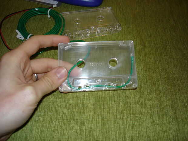 También tiene que haber un camino para que el alambre el entrar en la parte posterior de la cinta. Para ello, utilice una sierra pequeña manía y los alicates para cortar un pedazo hacia fuera cerca de una de las aberturas redondas. Un cuchillo pequeño puede trabajar así, pero ten cuidado como plástico de estireno es frágil y se agriete. Asegúrese de hacerlo sólo en la parte posterior de cada cassette.