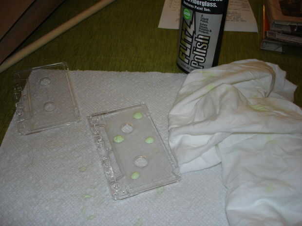 Luego, la superficie de la cinta será mate y opaco. Ver imagen 5. Usar plástico polaco para aclarar encima de. He utilizado un esmalte de moda Flitz que parecía y olía a pasta de dientes. Probablemente incluirá instrucciones en la botella: limpiar, aplicar, pulir con un paño, repetición.