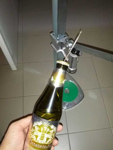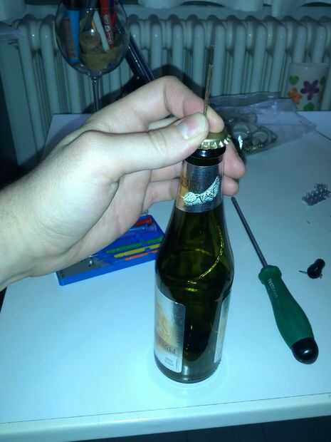 3) ahora está listo para cerrar la botella... Si usas botellas de tornillo listo! Si como yo usted eligió la clásica tapa corona botellas, usted necesita una máquina que capsula o si no tienes uno simplemente utilizar un martillo, un lazo metálico para tubos o unas pinzas y tal vez algún tipo de pegamento muy fuerte!!