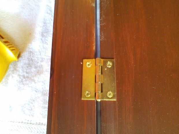 Abra el armazón de la cara como si fueran las bisagras. Ahora debería ver la cinta marca la caja y el marco. Se trata de que se atornille en sus bisagras. Cuando se cierra la puerta, la bisagra se intercala entre las dos piezas.