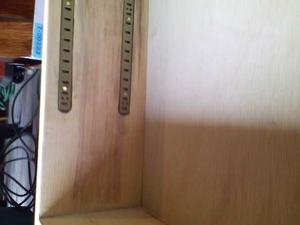En primer lugar, añadiremos las tiras de estantes en el interior de la caja. Estos deben nestle suavemente en las ranuras que hiciste para ellos. Habrá cuatro tiras de estanterías para el cuadro: dos de cada lado. Asegúrese de que los cuatro de ellos están a nivel uno con el otro; tendrá sus estantes a nivelarse cuando termines. Estas estanterías de tiras vienen con pequeños clavos o tornillos que se fijan dentro de su caja.