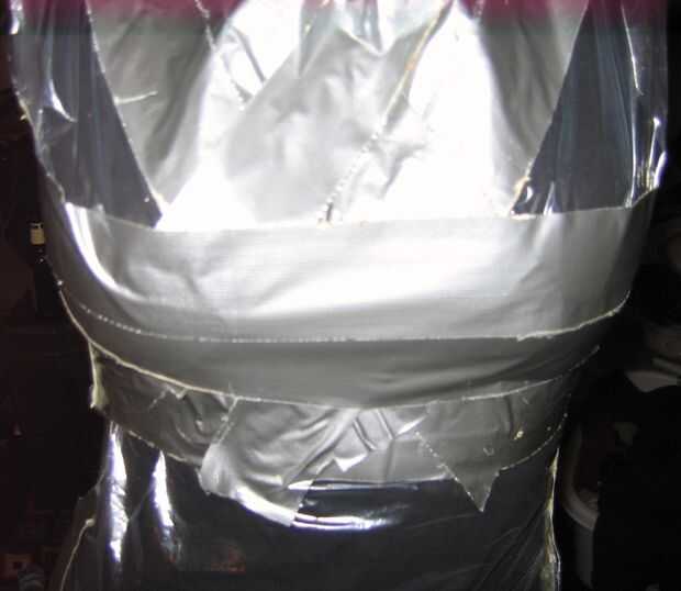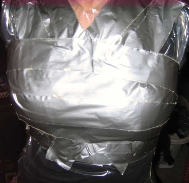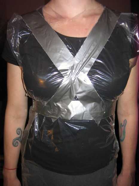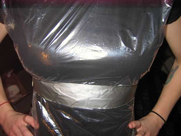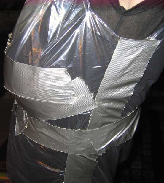 Ya puede comenzar a grabar en el busto. Comenzar justo por encima de su primer pedazo de cinta que fue alrededor de su modelo y la cinta horizontalmente a través del busto y alrededor a los lados. La longitud de la cinta que uso para este paso debe ser igual a la anchura de su modelo más aproximadamente cuatro pulgadas por lo que cinta para envolver alrededor de los lados. Continuar grabando por encima de la última pieza hasta que ha cubierto la mayor parte del pecho de su modelo, o de cuatro a cinco tiras de cinta.
