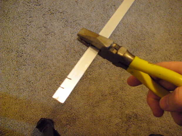 Prácticamente cualquier medio de obras de corte. Usé las secciones lata snip de los alicates para poner una muesca en el metal y luego lo dobló varias veces hasta que fracturó en ese momento. (Como lo haría un clip). Desbarbar los bordes con papel de lija si es necesario.