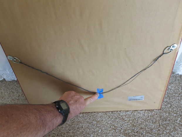 Coloque la fotografía para ser colgado en el piso boca abajo con la espalda mirando hacia usted. Tire hacia abajo en el centro del alambre de soporte. Sitúe el punto justo por encima de esta curva. Mueva con cuidado el cable colgando fuera del camino para que golpee el punto.