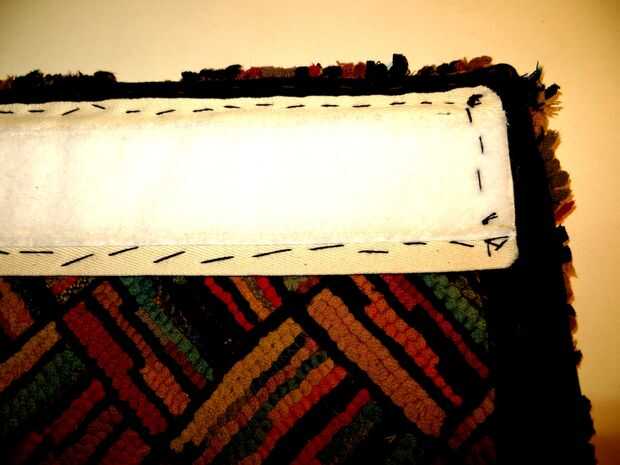 - Cortar la cinta de sarga de algodón ancho de 3" a una dimensión por debajo de la anchura de la parte superior de la alfombra que están colgando. La cinta debe venir dentro de 1/4" o 1/2" del borde de la alfombra, mientras más cerca mejor. Si su tapete no ya está enlazado en la parte posterior con cinta de ribete, probablemente debe que hacer.
