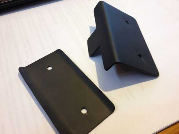 Estoy mostrando las piezas de acabado polvo negro cubierto, sino mis piezas de prototipo inicial que utilicé para el diseño de estos soportes. Puedes ver cómo se montan los soportes de pared a la pared con tornillos para madera en postes de madera y un ancla de pared (para los tornillos no van en los montantes de pared). El soporte de grapa montado en el objeto pesado se coloca orgulloso de borde del objeto por aproximadamente 1/4" pero puede que tenga que ajustar esto dependiendo de cuántas arandelas se utilizar como espaciadores para la pared y todos cómo exacto son sus curvas.