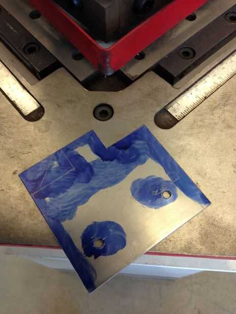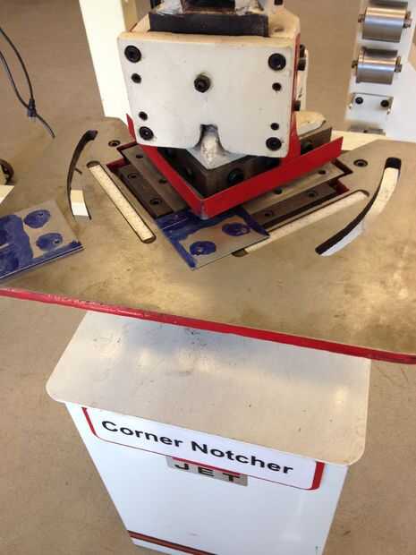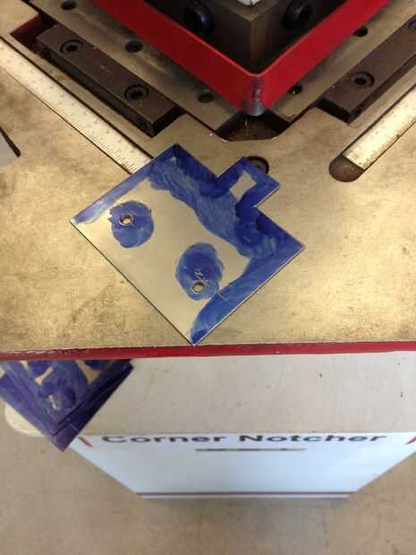 Utilizar la máquina Notcher de la esquina en TechShop para cortar las esquinas en los soportes que se adhieren a nuestro objeto pesado. Nota que de chapa calibre 16 es el máximo grosor de para que esta y otras máquinas de chapa en TechShop están diseñados. Tomará un poco de fuerza en el brazo de la máquina para cortar a través. Yo peso aproximadamente 200 libras y tuvo que poner más de mi peso en la corte.
